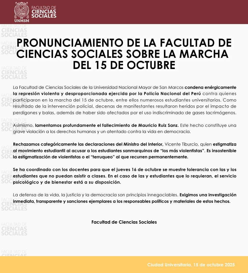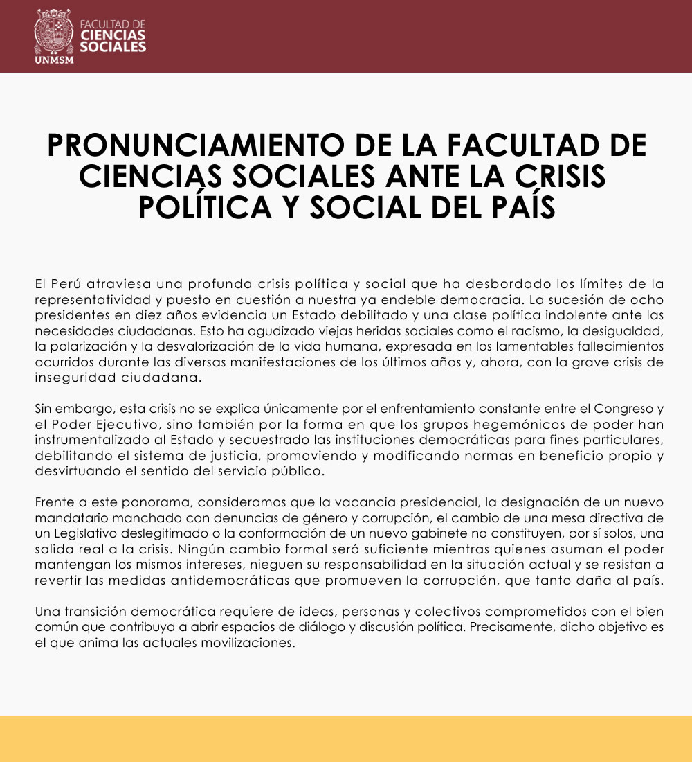 PRONUNCIAMIENTO DE LA FACULTAD DE CIENCIAS SOCIALES DE LA UNMSM